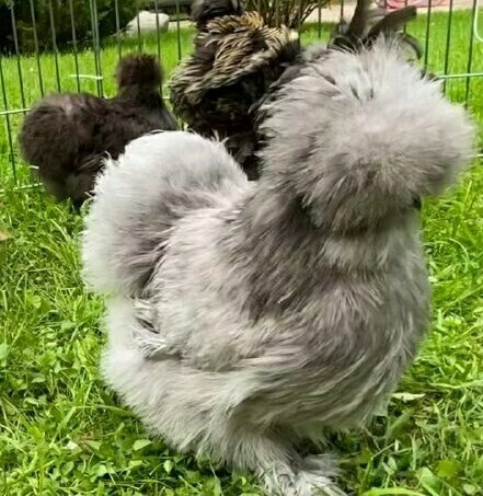 Китайская шелковая курица – декоративная легкая порода, достаточно крупных размеров и довольно подвижная. Имеет карликовую форму.Куры имеют пять пальцев. Этот признак стойко передается потомству. Ноги и пальцы оперенные. На голове имеется хохол, борода и баки. Гребень небольшой, розовидный без зубца. Хохол у петуха направлен назад. Окраска оперения – белая, черная, дикая, голубая и тд.. Кожа и мясо – черного цвета. Мочки бирюзового цвета, клюв и гребень – синие...